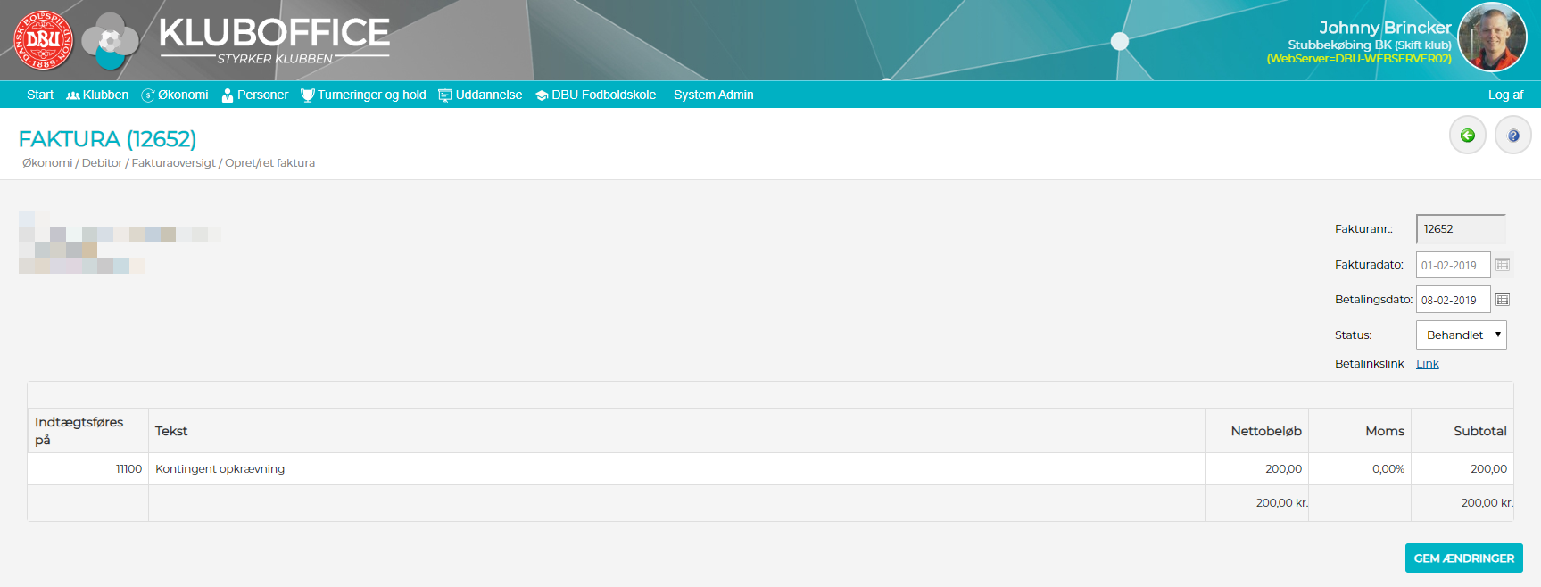 Herefter kan du så se selve faktura linjerne m.v., og har mulighed for at ændre status fra "Behandlet" til "Ventende", eller omvendt, samt rette forfaldsdato til enten en senere eller tidligere dato. Når du har lavet dine eventuelle ændringer, skal du klikke på "Gem" for at gemme disse.