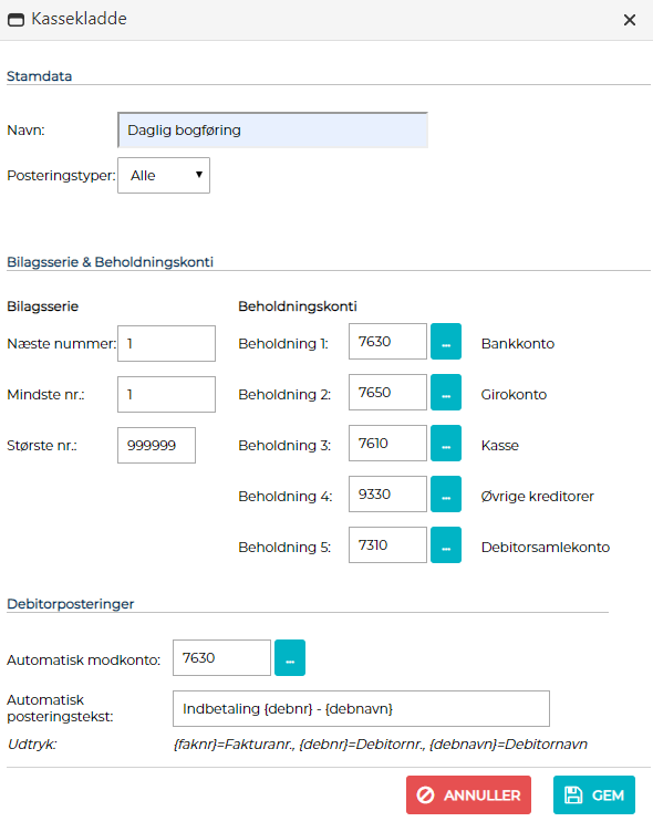 Her skal angives minimums- og maksimumsnummer, samt en angivelse af hvad næste ubrugte bilagsnummer er. - Beholdningskonti. Her kan der vælges op til 3 konti, som ønskes løbende opsummeret under indtastning i kassekladden. Dette kan eksempelvis være kasse, bank og giro.