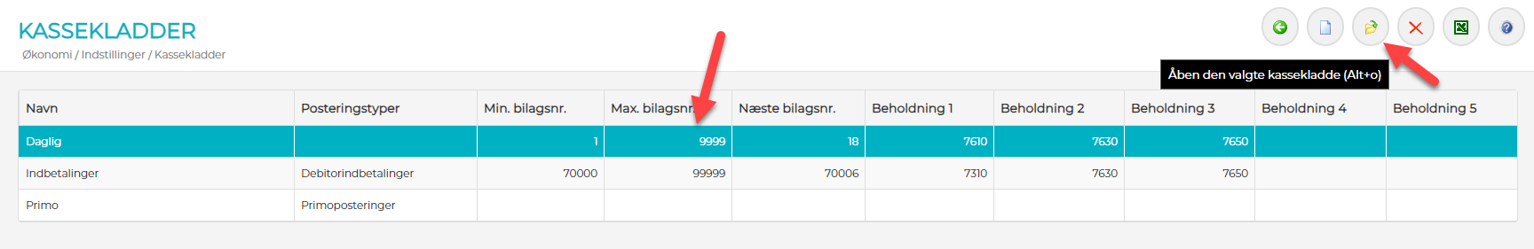 1) Marker den kassekladde du ønsker at åbne/redigere, og tast Alt+o eller klik på ikonet for "Åben den valgte kassekladde"