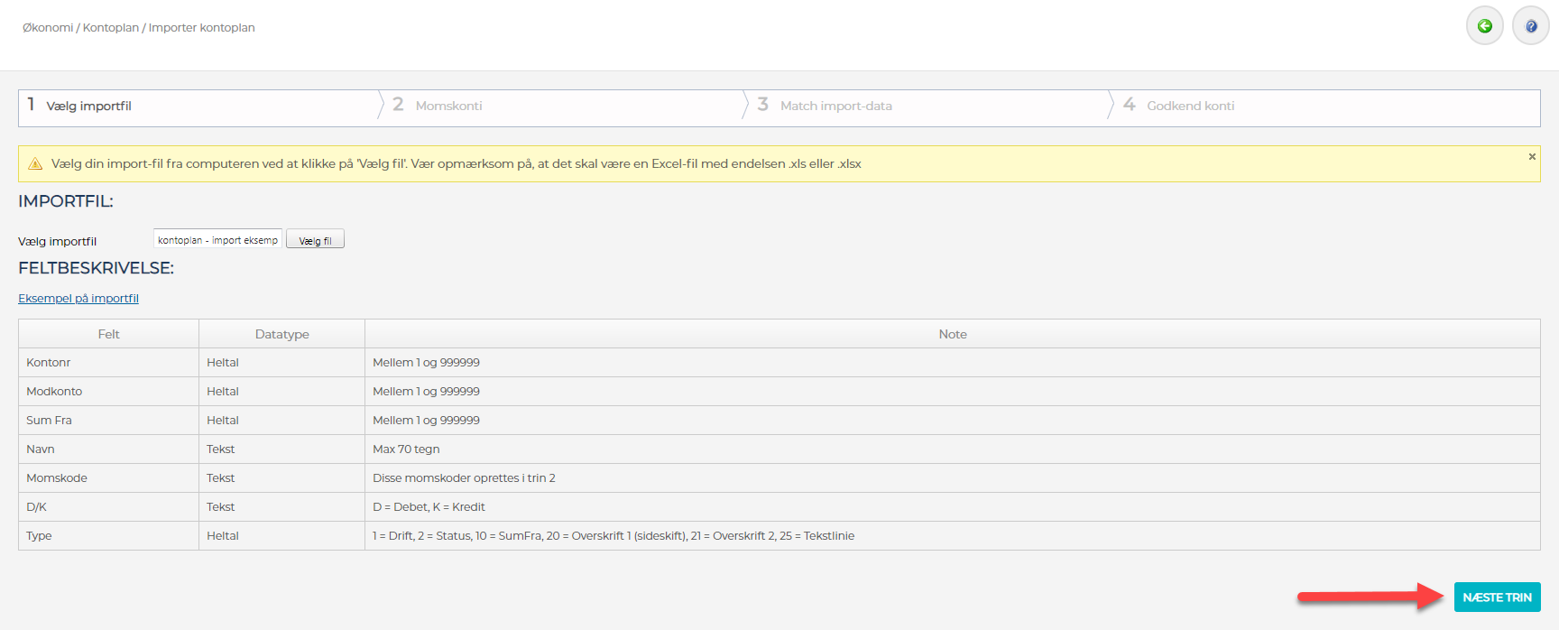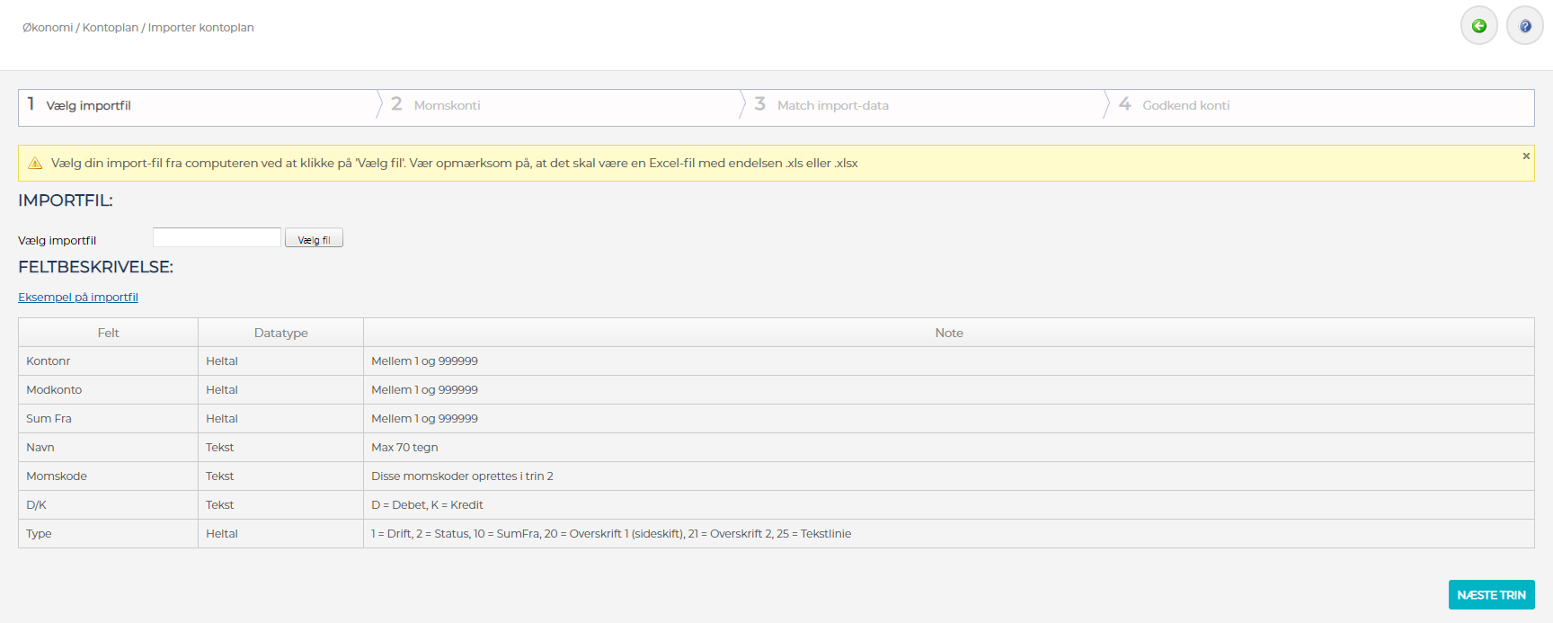 2) Klik på "Vælg Fil" (Du har her også mulighed for først at downloade en eksempel kontoplan, som du kan arbejde med og tilpasse inden import)