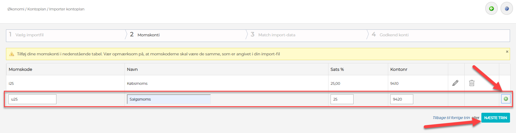 5) Hvis klubben er momsregistreret, skal der defineres momskonti. Typisk skal der defineres én konto for købsmoms og én konto for salgsmoms. Udfyld felterne og klik på det lille grønne plus, for at tilføje linjen. Når alle momskonti er defineret og tilføjet, så klik på "Næste trin"