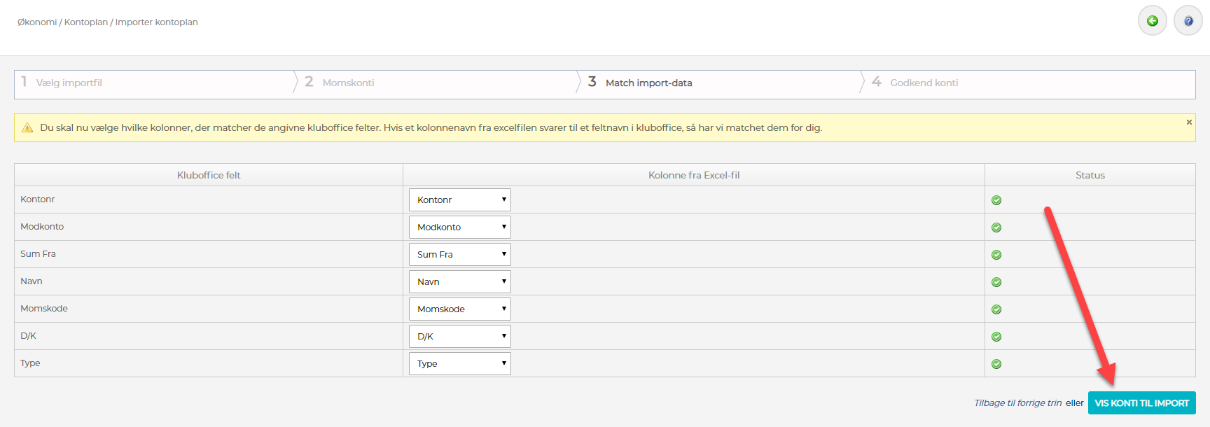 6) Du har her mulighed for at matche de forskellige kolonner, fra excel arket du er ved at importere, til KlubOffice felterne. Har du brugt eksempel kontoplanen, så skulle alle kolonner automatisk blive matchet. Klik derefter på "Vis konti til import"