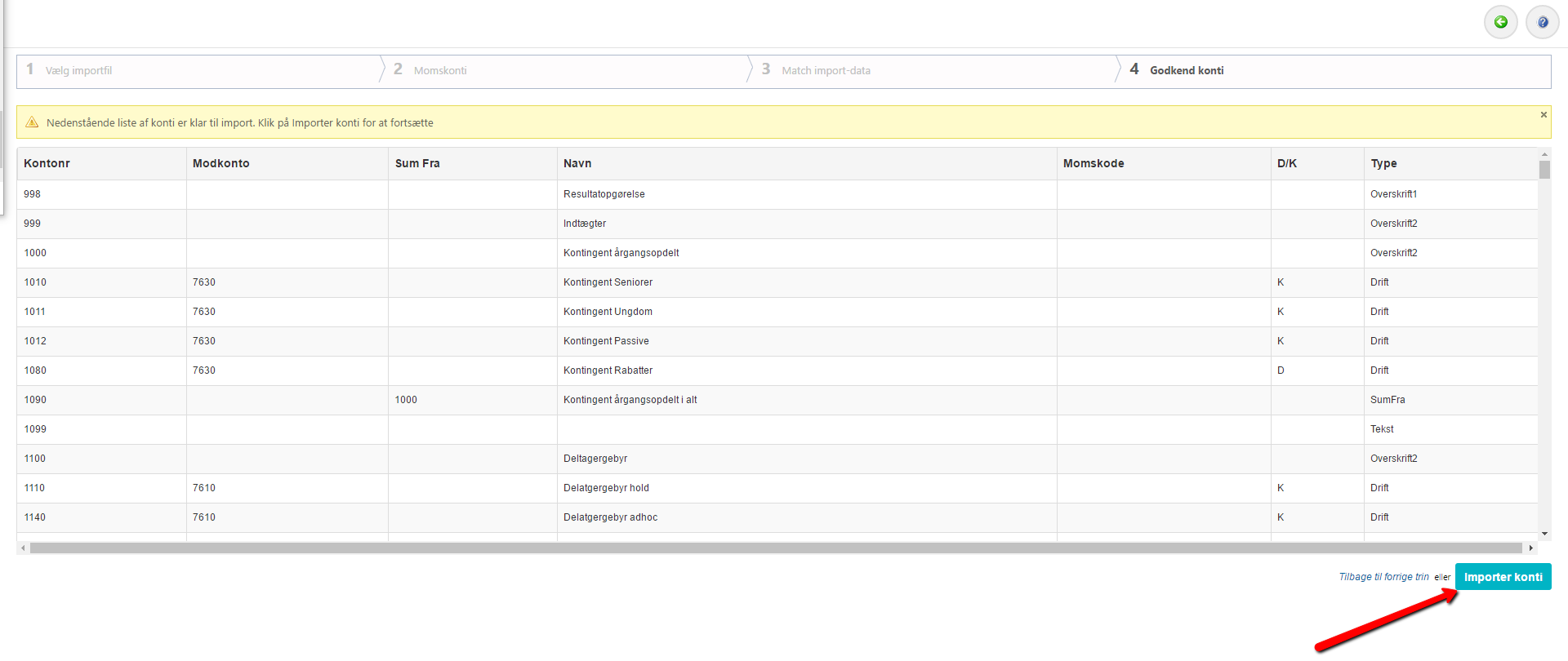 7) Du får nu et komplet overblik over hvilke konti m.v. som vil blive importeret/rettet i kontoplanen når kontoplanen importeres. Hvis alt ser rigtigt ud, så klik på "Importer konti"
