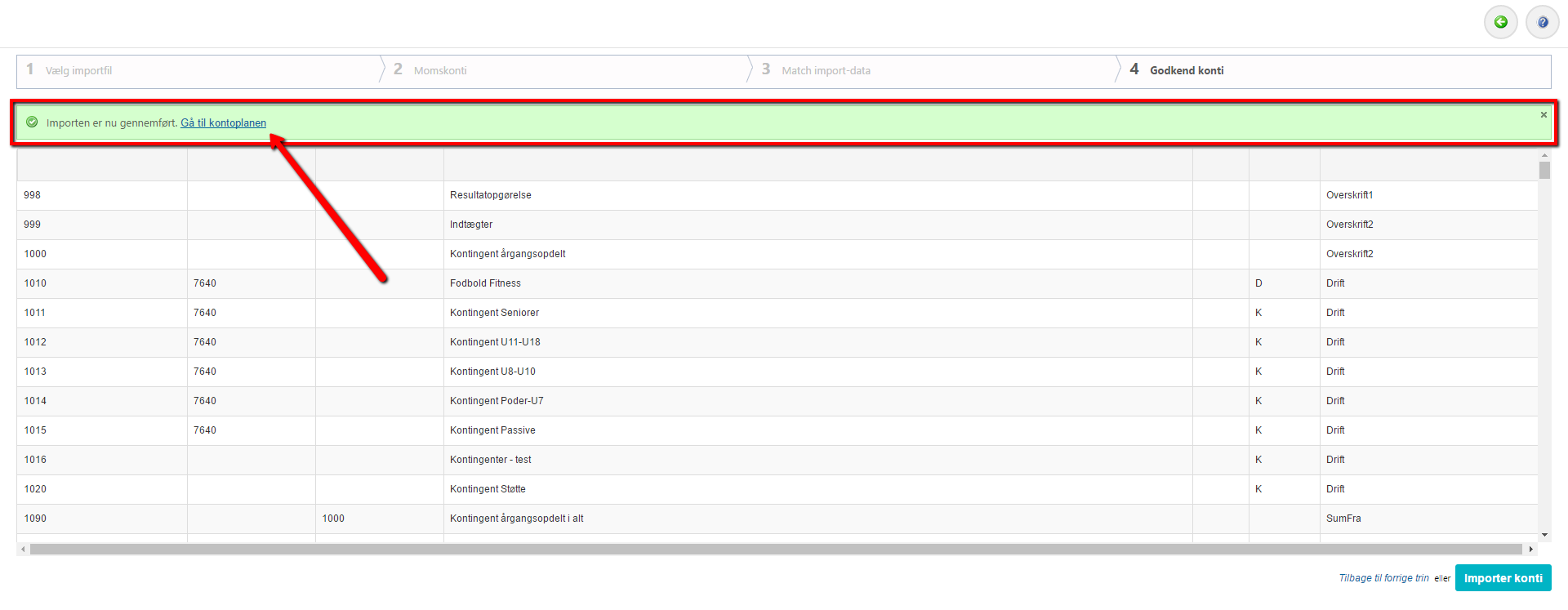 8) Kontoplanen er nu importeret, og du kan klikke dig direkte videre til kontoplanen.