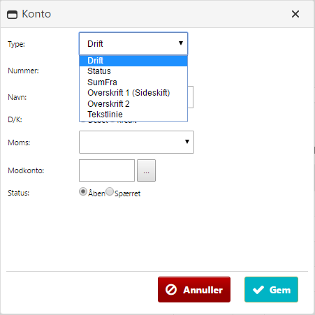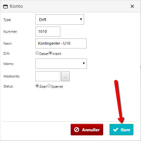 3) Udfyld Nummer, Navn, D/K og vælg om der skal være moms og/eller en modkonto. Vælg til sidst om kontoen skal være åben eller spærret og klik på "Gem"