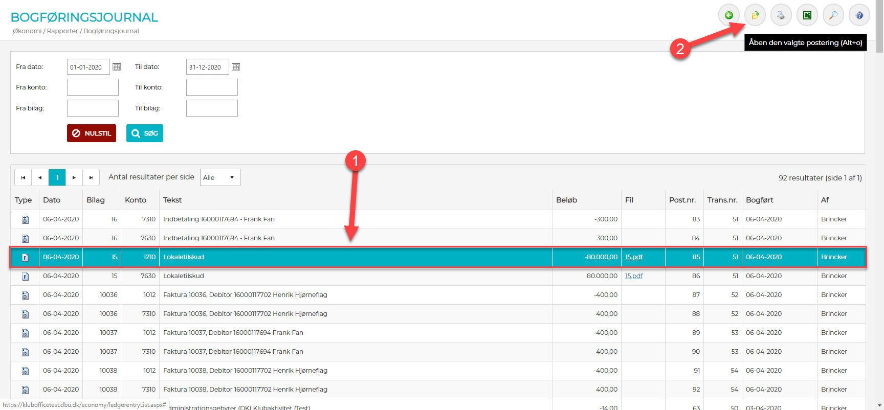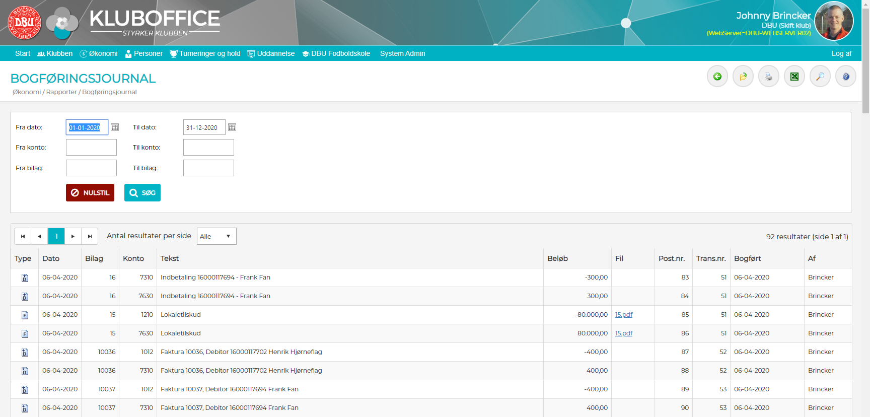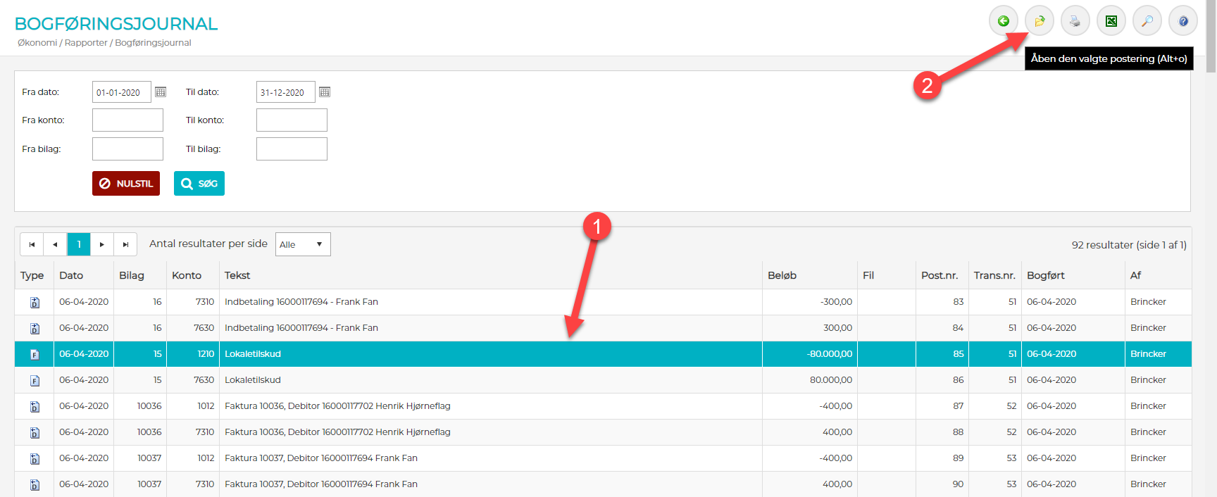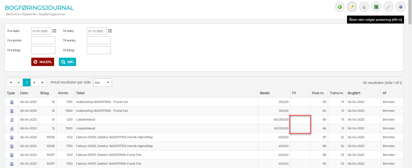 Menupunkt - "Økonomi" -> "Rapporter" -> "Bogføringsjournal"