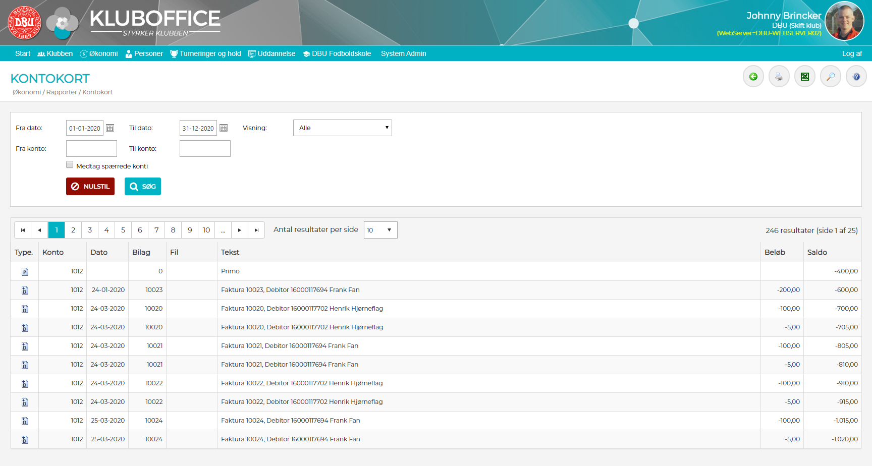 Menupunkt - "Økonomi" -> "Rapporter" -> "Kontokort"