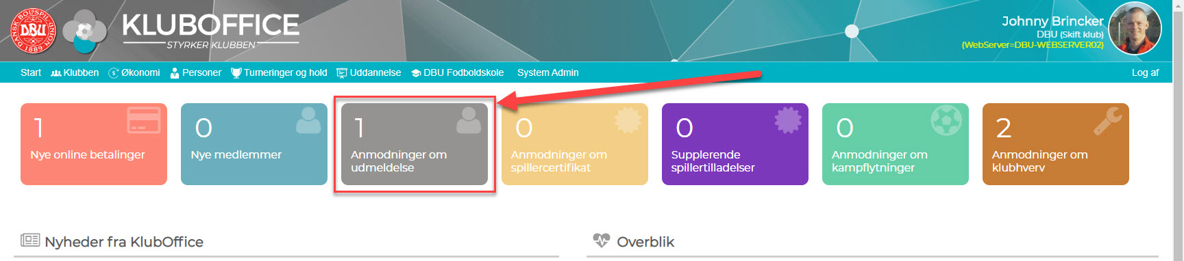 Når funktionen er aktiveret, kan man på forsiden af KlubOffice se, hvor mange anmodninger om udmeldelse som er der afventer behandling i klubben. Herfra kan man så klikke sig direkte ind til siden med oversigten over anmodninger om udmeldelse.