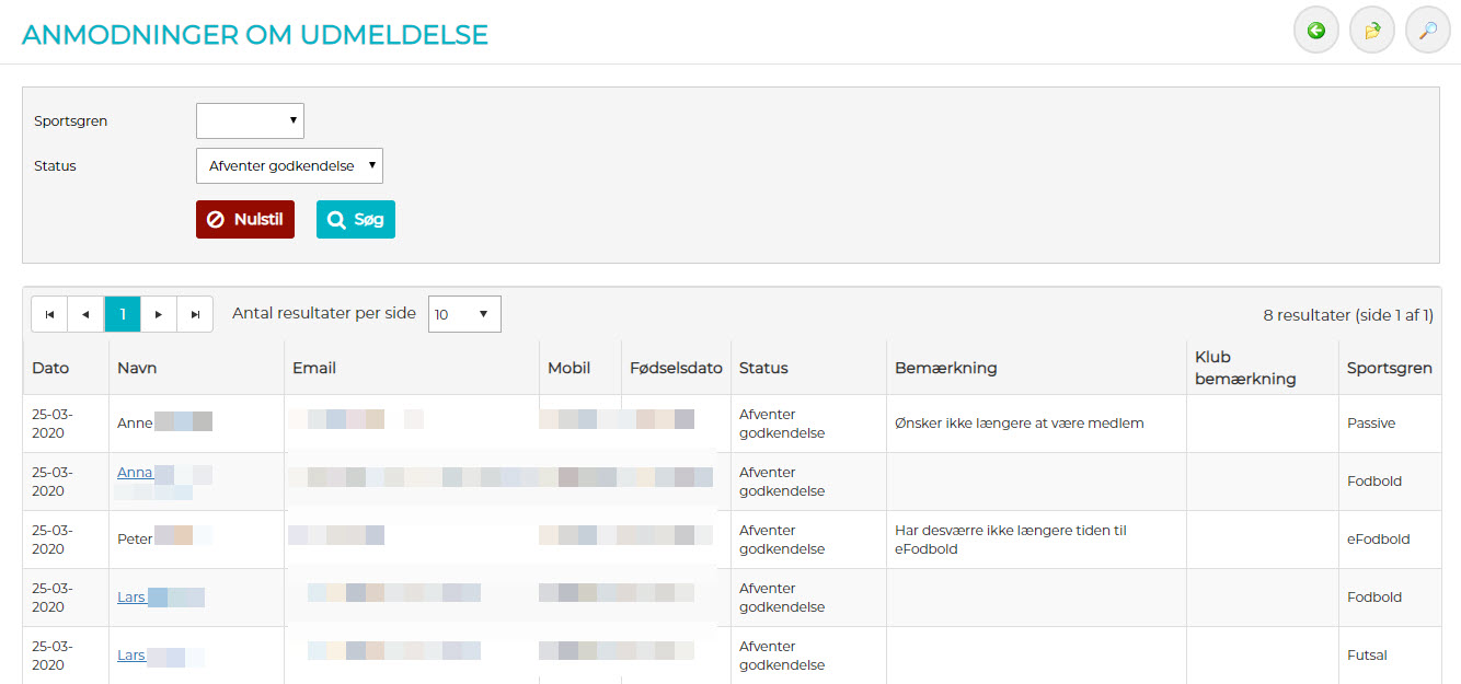 Når man så har klikket sig videre ind til siden, som man også kan finde via menu strukturen under "Personer -> Medlemmer -> Anmodninger om udmeldelse", så vises de medlemmer som har sendt en anmodning om udmeldelse til klubben.