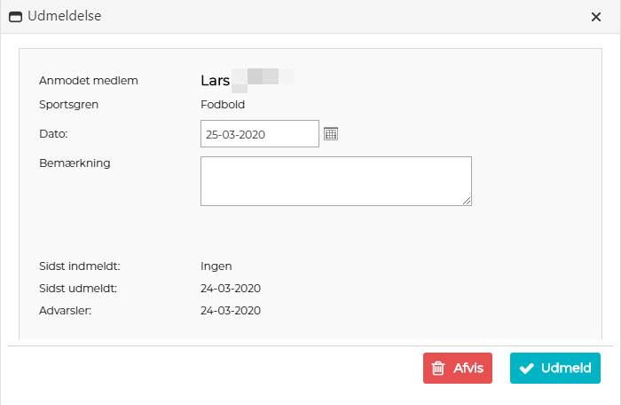 For at medlemmer kan anmode klubben om udmeldelse, så skal klubben først tage stilling til hvorvidt det er overhovedet tillades i klubben. Se her hvordan du aktiverer "Anmodning om udmeldelse" i klubben.