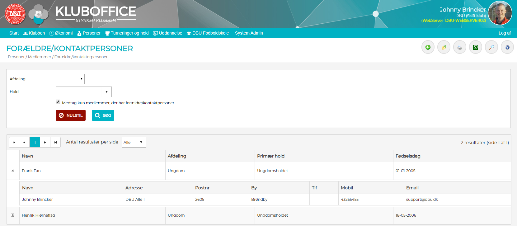 I denne sektion er det muligt at finde de medlemmer/spillere, som har en eller flere kontaktpersoner tilknyttet.