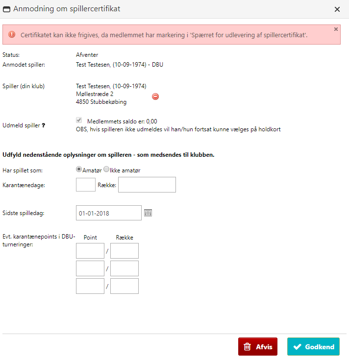 6) Er medlemmet spærret for udlevering af spillercertifikat, vil anmodningen ikke kunne godkendes, og der vil i stedet fremkomme en advarsel i toppen, med besked om at "Certifikatet kan ikke frigives, da medlemmet har markering i 'Spærret for udlevering af spillercertifikat'."