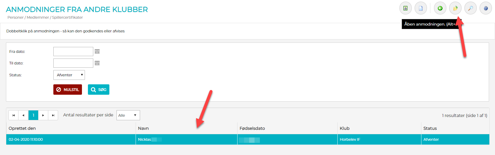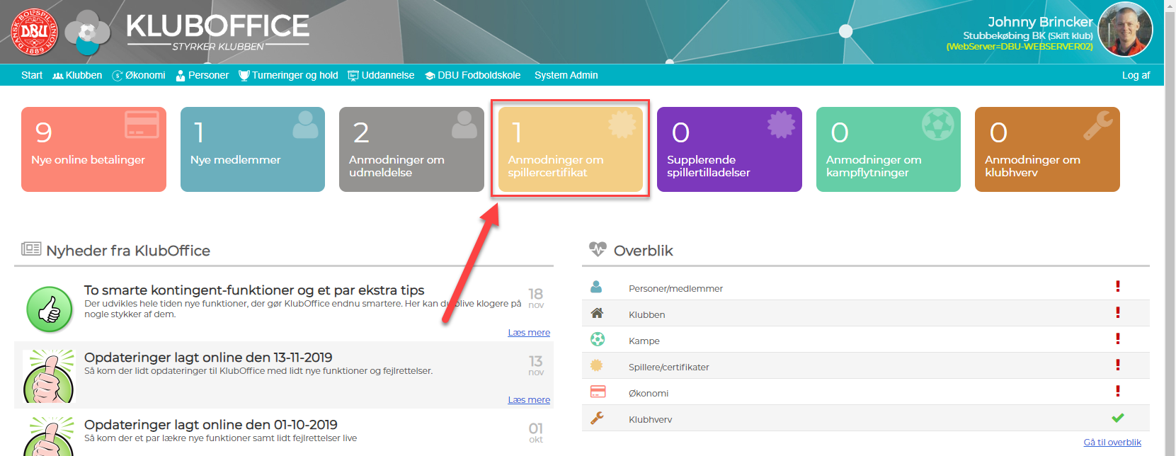 Anmodninger om spillercertifikater fra andre klubber, ender i området "Anmodninger fra andre klubber" og antallet vil blive vist på forsiden af KlubOffice.