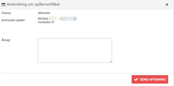 3) Skal en anmodning afvises - så SKAL der skrives en årsag - som personen der afsendte anmodning vil kunne se og modtage på mail. Indtast derfor en årsag, og klik på "Send afvisning"