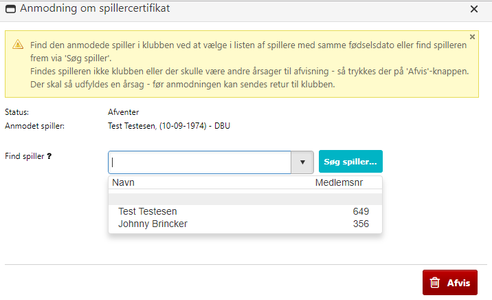 4) Har anmodningen ikke automatisk fundet et match, så brug dropdown feltet, eller søg den relevante spiller frem.