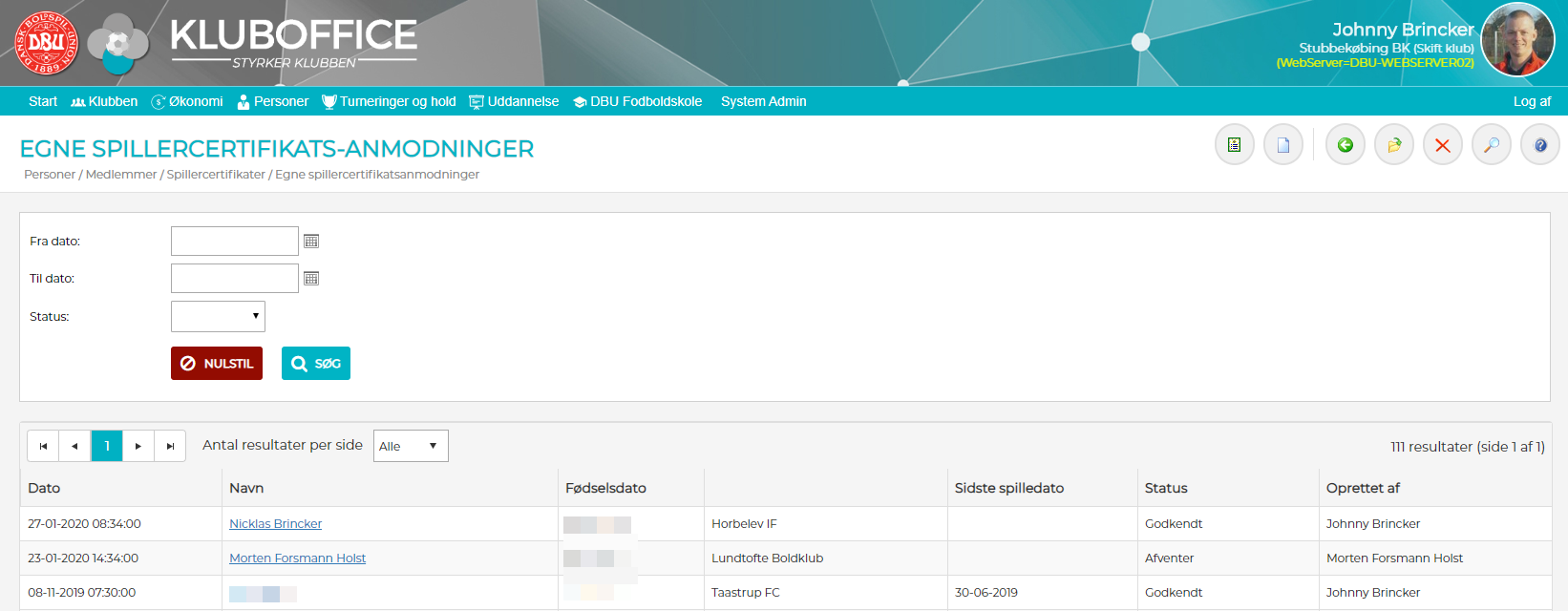 Her kan man se de anmodninger som klubben har afsendt - deres status og hvem der har afsendt den.