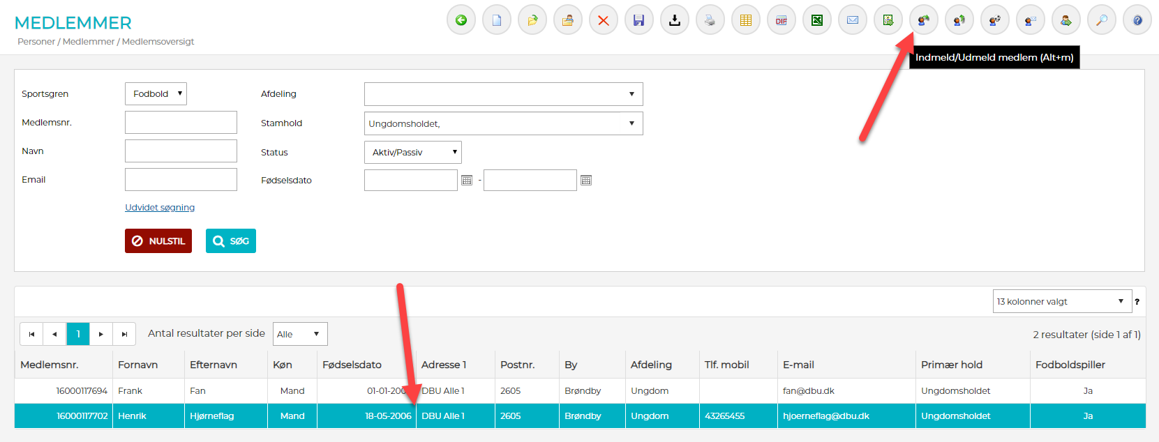 1) Søg medlemmet frem i medlemsoversigten, og klik på "Indmeld/Udmeld medlem"