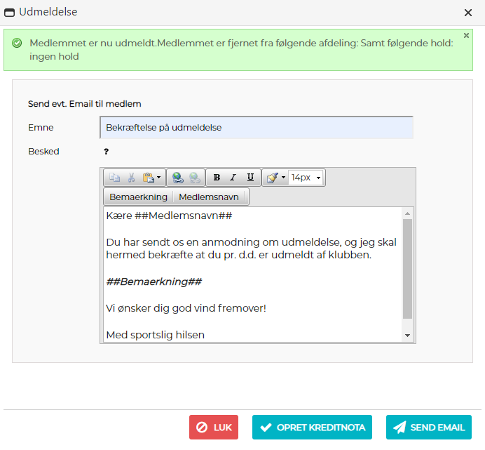 3) Medlemmet er nu udmeldt og spærret for udlevering af spillercertifikat. Var der en restance på medlemmet, og du vil oprette en kreditnota, kan dette gøres ved at klikke på "Opret kreditnota", ellers klik på "Luk"