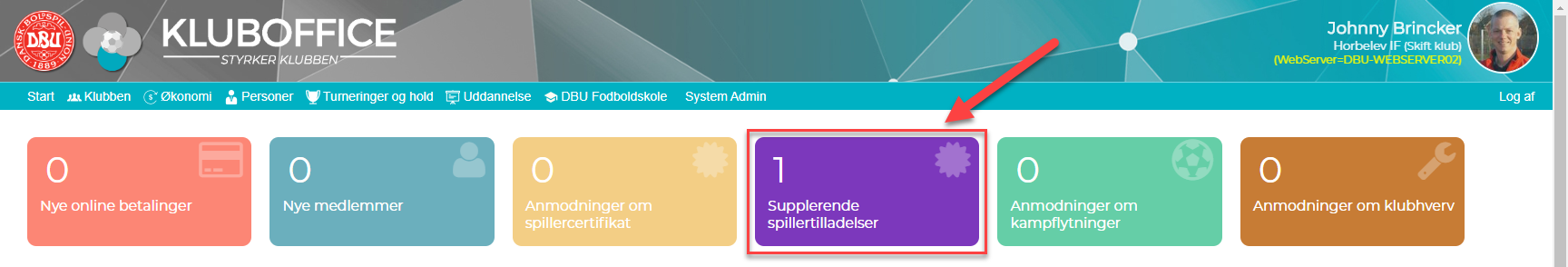 På forsiden af KlubOffice er den en blå boks med antal af ventende supplerende spilletilladelser, som klubben endnu ikke har behandlet.