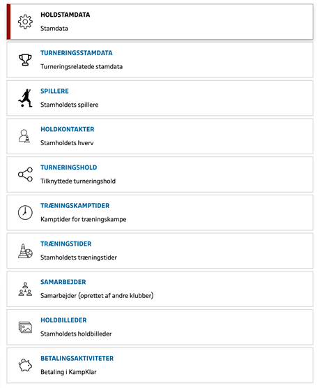 Her sættes de stamdata, som bruges ved en holdtilmelding af et 'turneringshold' - således at man ikke skal indtaste oplysningerne igen - men bare kan trykke næste ved en holdtilmelding.