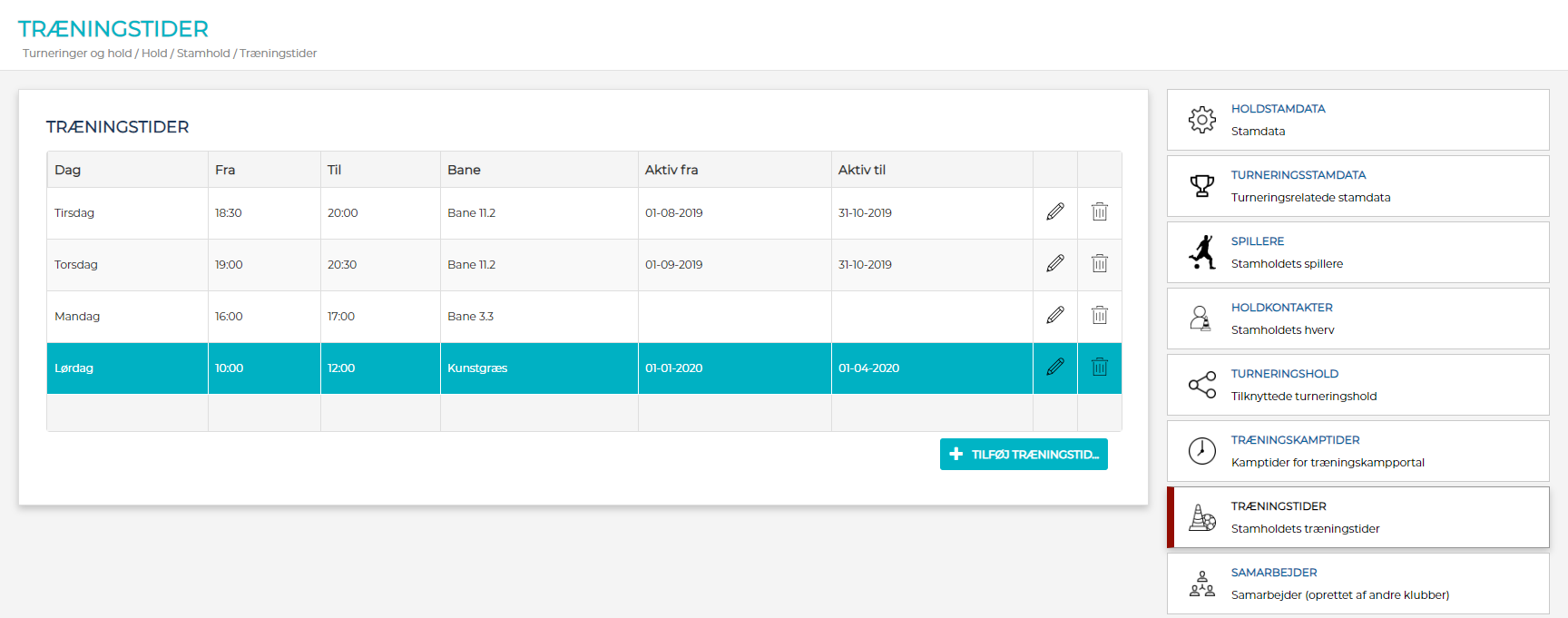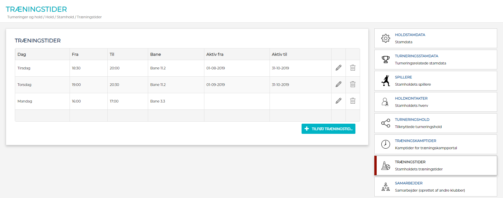 Et samlet overblik over alle stamholds træningstider, kan findes i menuen "Turneringer og hold -> Træningstider"