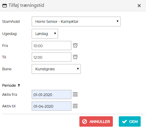 Klik på "Tilføj træningstid", udfyld informationerne og klik på "Gem".