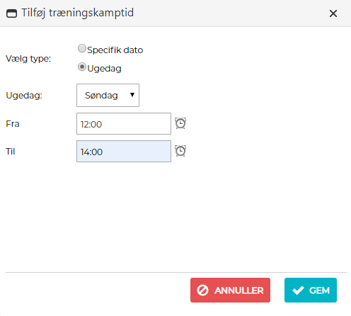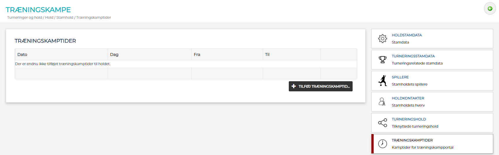 Her kan du tilføje de tidspunkter, hvor holdkontakter skal have mulighed for at oprette træningskampe.