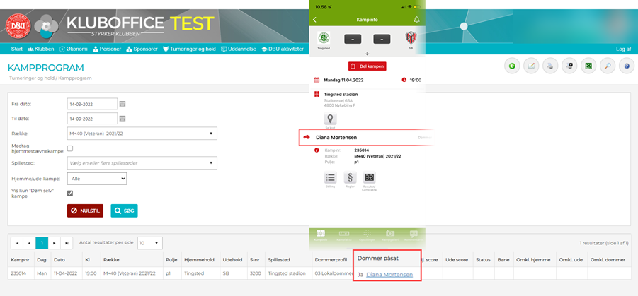 Dommeren vises herefter i kampprogrammet i KlubOffice – men også på kampen i Fodbold app’en, hvor man på kampsiden kan se, hvem der styrer slagets gang.