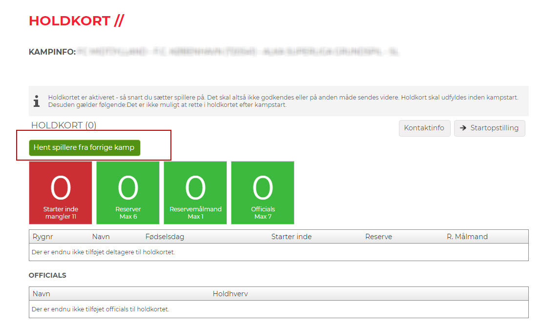 8. Når alle spillere er på plads, skal officials tilføjes på samme måde. Officials SKAL være oprettet som holdkontakter - før de kan vælges.
